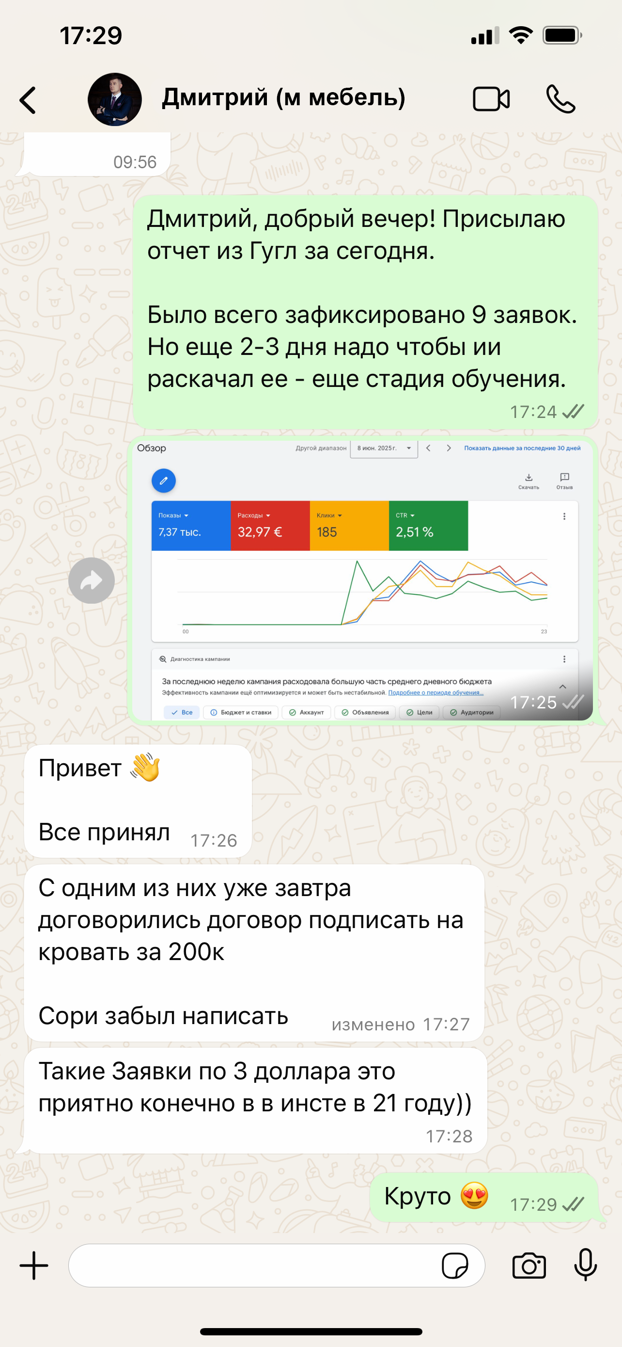 Вы получаете стабильные заявки и ежедневные отчеты + план по увеличению бюджета.